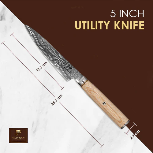 Product Description: Introducing our premium Utility Knife, crafted with precision and durability in mind. This 5-inch knife is designed to handle a variety of cutting tasks with ease. Made from 67 layers of S35VN Power Core Damascus Steel, it offers exceptional strength and sharpness. The handle is crafted from environmentally friendly Pakka Wood, providing a comfortable and secure grip. With a hardness rating of 62 HRC, this knife is built to last and deliver outstanding performance in the kitchen.