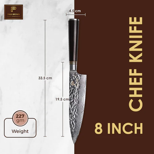 ✅ HIGHEST STANDARD PAUL BROWN QUALITY- a PAUL BROWN is a combination of Outstanding craftsmanship and cutting-edge breakthrough technology, awe-inspiring design, and the absolute best materials available. The 67 Layers real forged steel with hammered pattern supporting real VG-10 high carbon super steel is complemented by a traditional dense ebony wood handle and gives you ultra-smooth and precise use for all needs like meat, fish, vegetables fruits, etc.